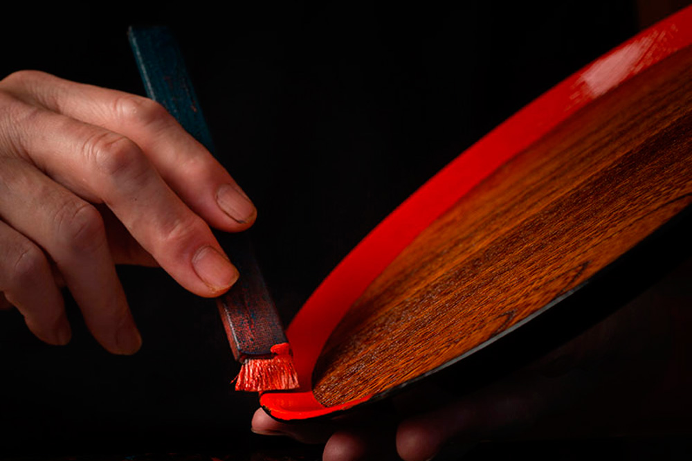 復刻された敷島盆の製作工程は17にも及ぶ。木地は石川県の山中で引いてもらうが、それ以外は全て黒江で行う。中でも特筆すべきは、池原さん自身が中塗りまでの7割を手がけている点だ。